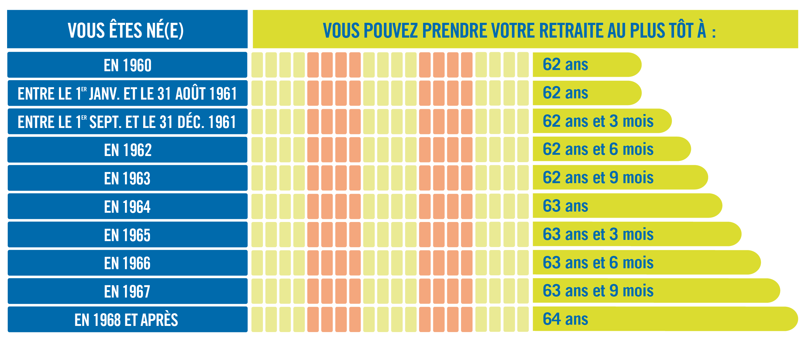 L’âge légal de départ à la retraite (âge d’ouverture des droits à la retraite) est fixé à 62 ans et 3 mois pour les personnes nées à partir du 1er septembre 1961*. Cet âge légal est progressivement décalé de trois mois supplémentaires chaque année pour atteindre 64 ans en 2032 pour les personnes nées à compter de 1968.
